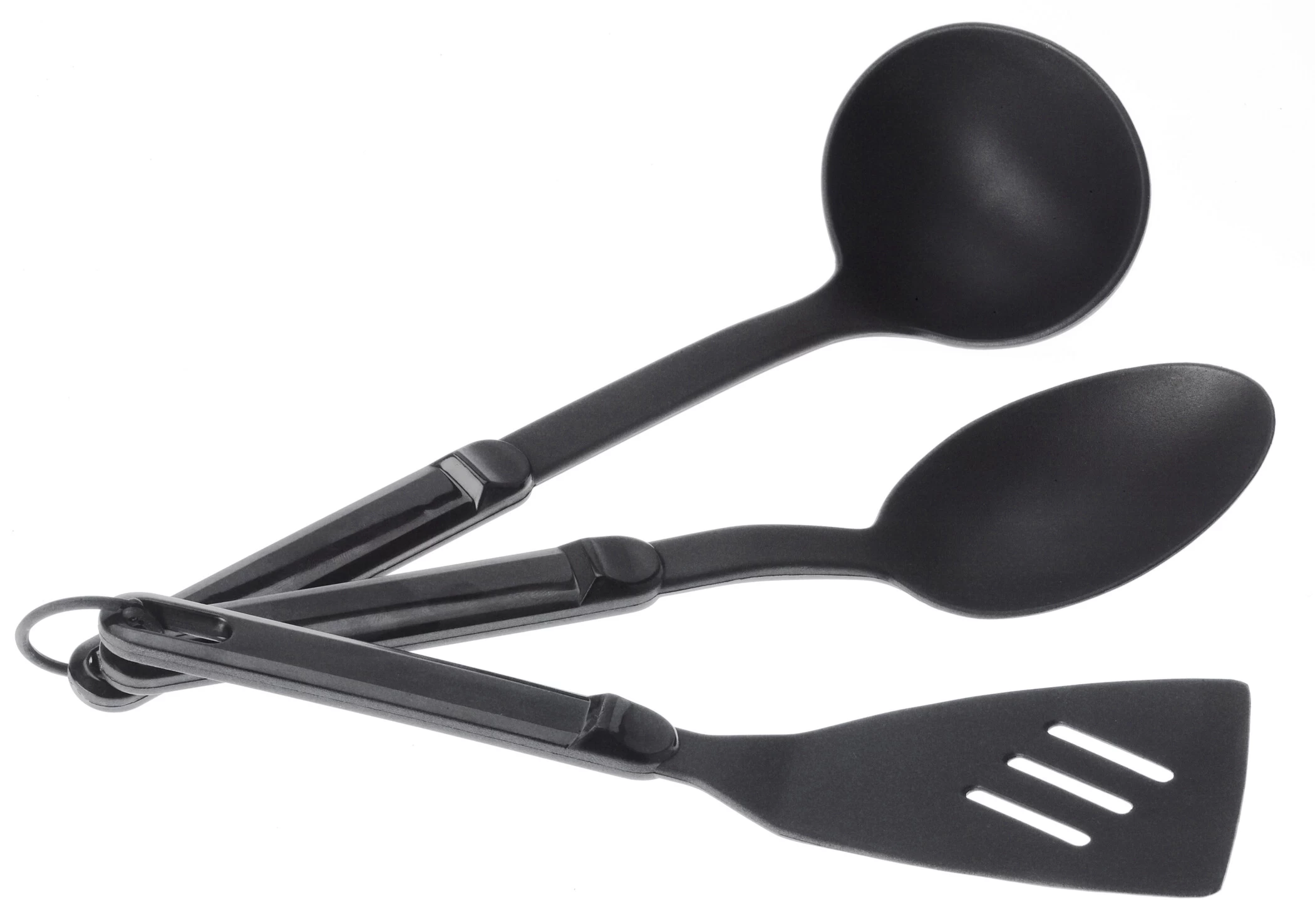 3-delig bestek, bestaande uit pollepel, pannenlikker en grote lepel. Alle onderdelen zijn gemaakt van hittebestendig nylon materiaal (tot 220°C). De ring is opgeruimd.