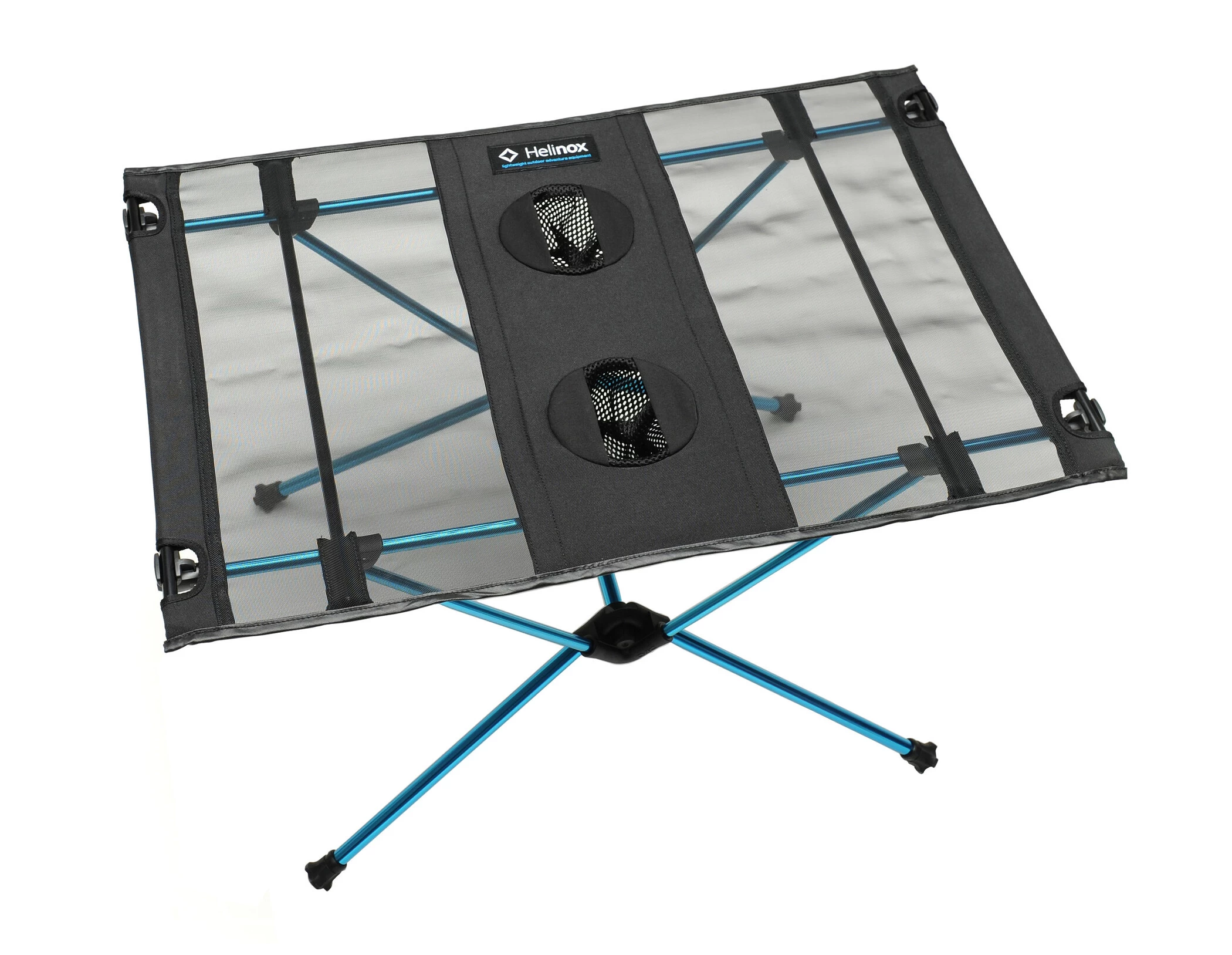 De montage gebeurt zeer snel in de unieke Helinox-stijl – de bandtechnologie helpt om de stokken en de naven in elkaar te steken. In het midden van de tafel bevinden zich twee verzonken bekerhouders om morsen te voorkomen. In het geval van gemorste vloeistoffen vergemakkelijkt het sterke materiaal van het netoppervlak het reinigen en minimaliseert de droogtijd.