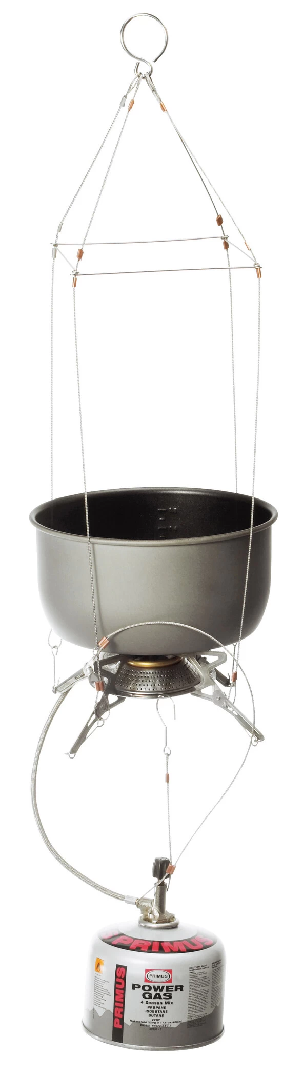 Om te koken in de bivak op de rotswand of om op te hangen in de boot. Houdt het fornuis en de gasfles bij elkaar. Een draadverspreider zorgt ervoor dat de pot gemakkelijk bereikbaar is wanneer deze wordt opgehangen. Voor fornuizen met vier poten.