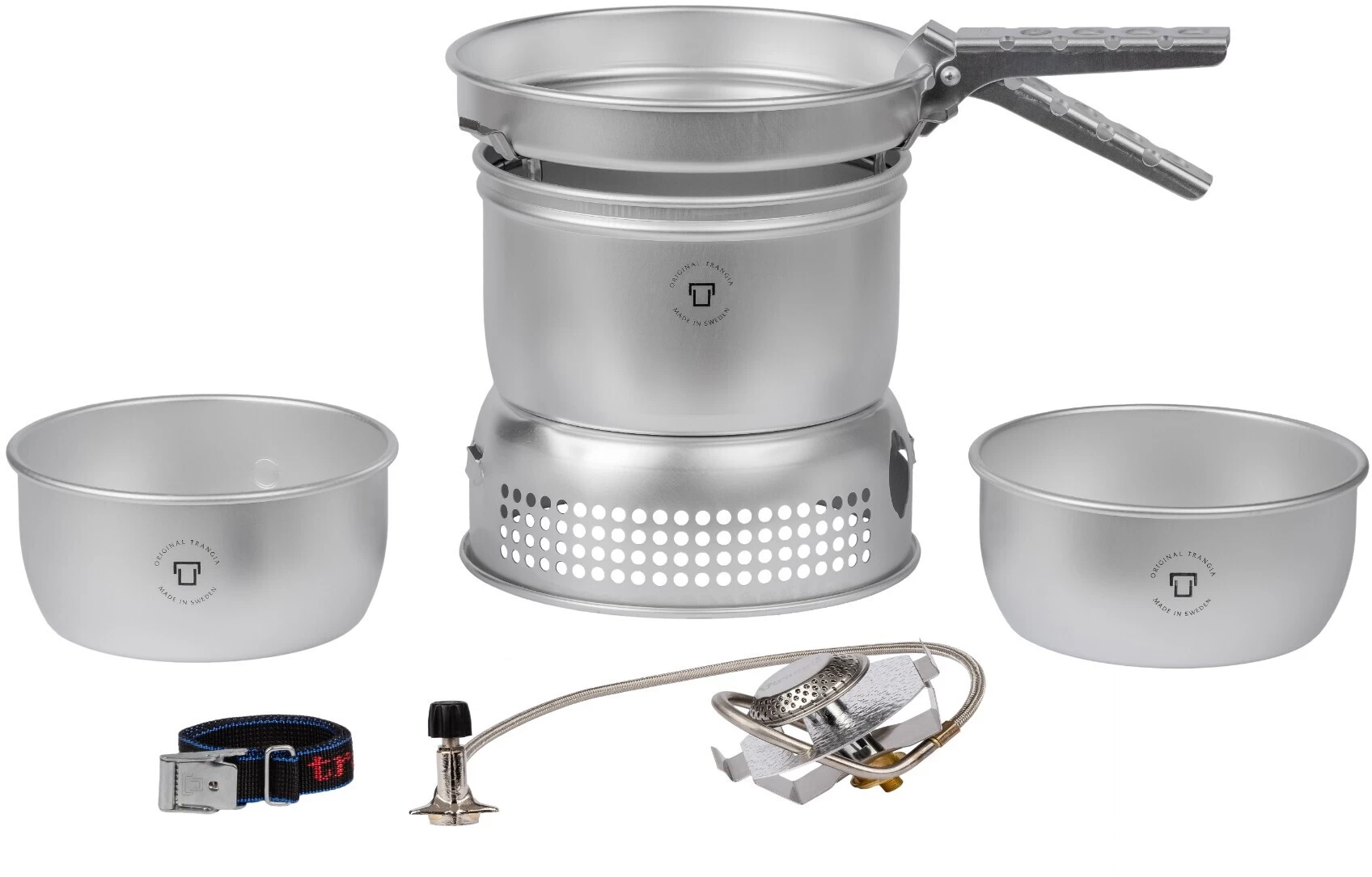 De 27-serie omvat fornuizen voor één of twee personen met kleiner kookgerei. Deze compacte kookset vereist minimale ruimte in de rugzak. Met de houders in de bovenste voorruit omhoog geklapt, kan het fornuis worden gebruikt met grotere potten uit het Trangia-assortiment.