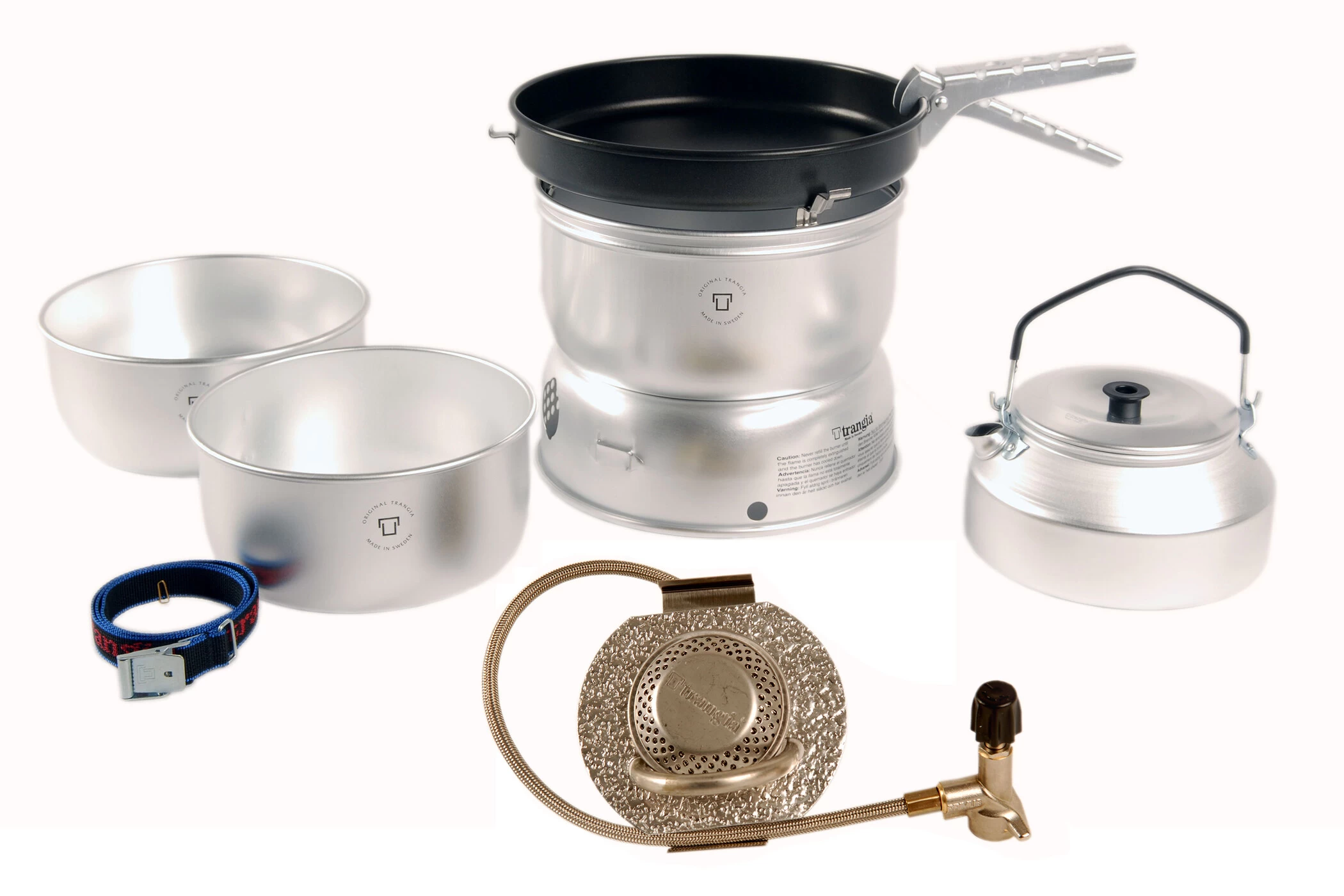 De serie 25 omvat grotere modellen geschikt voor groepen van 3 – 4 personen. Deze uitstekende familiesets bestaan uit grotere kookgerei, een bredere koekenpan en een grotere ketel. Met de houders opgevouwen kan het fornuis worden gebruikt met grotere potten uit het Trangia-assortiment.